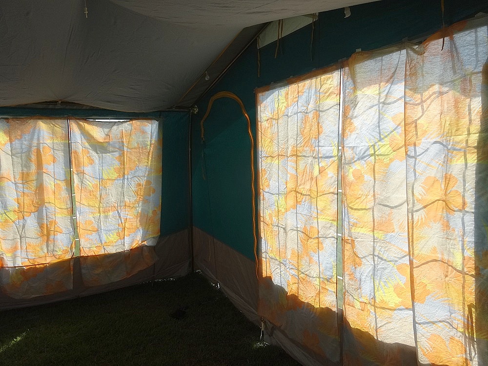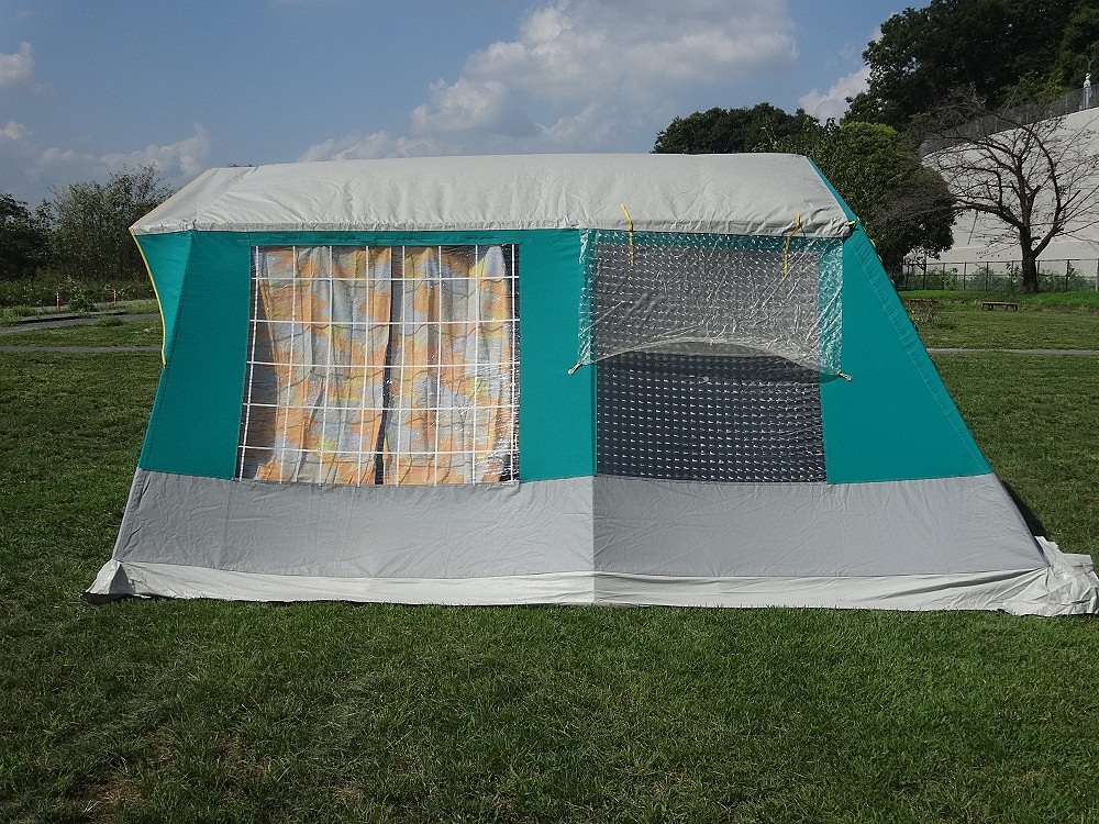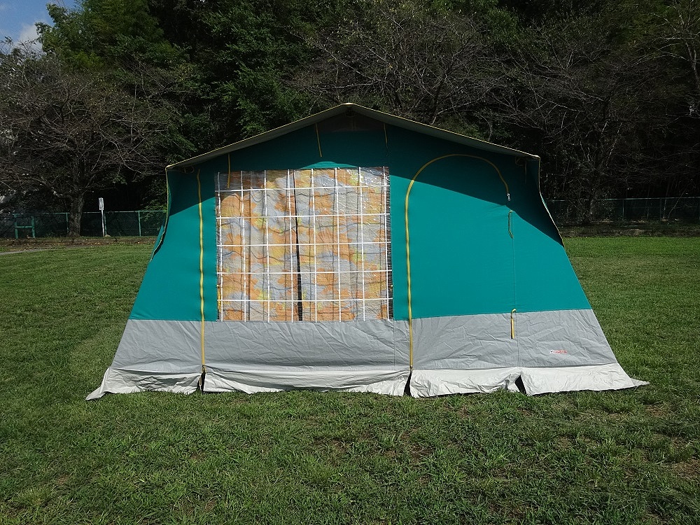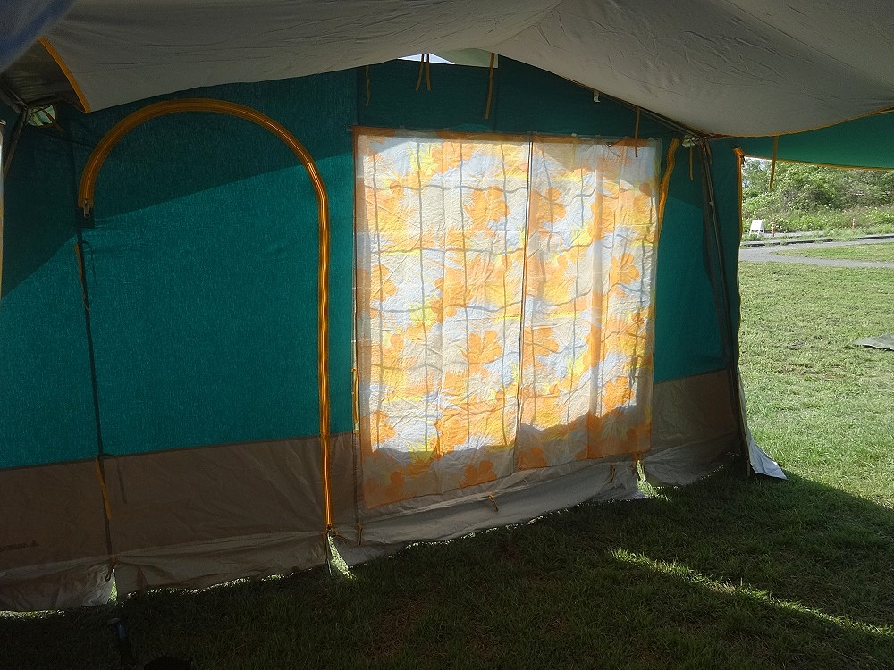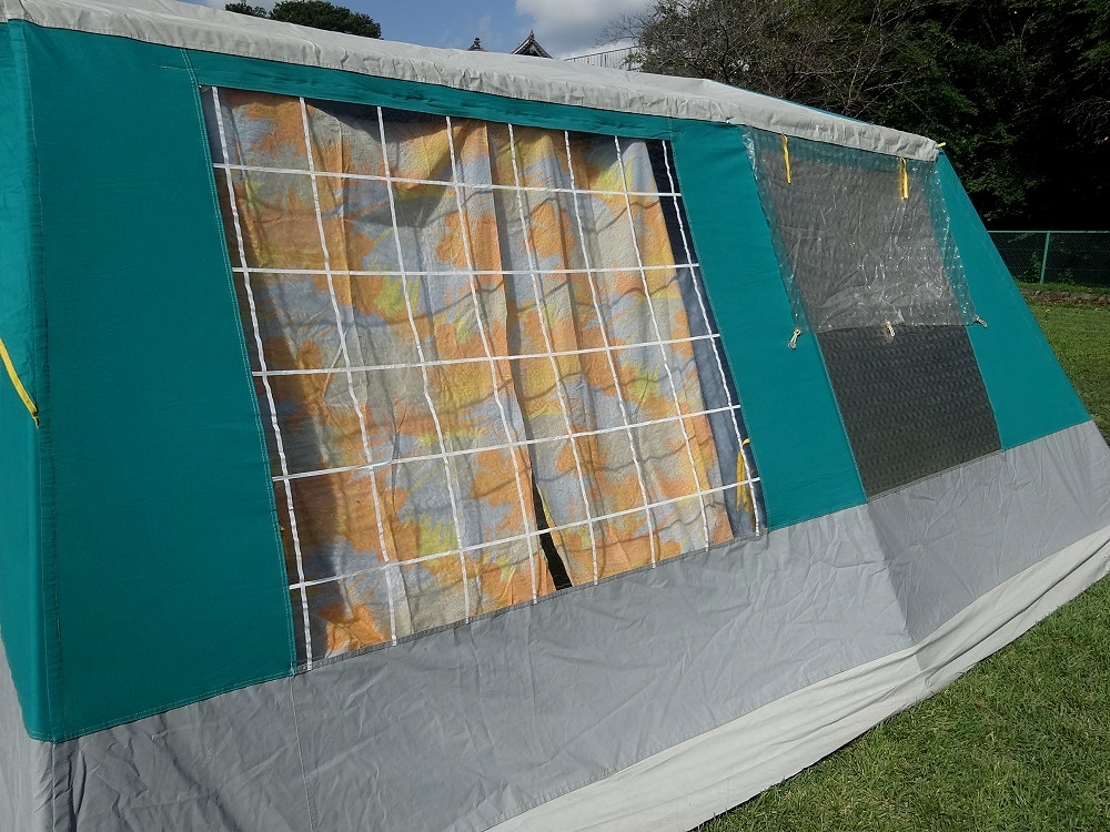 カーテンはパステルカラーの花柄生地で、おそらく80〜90年代前半のテントと思われます。